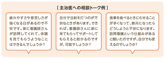 なお、主治医に相談する際には、「こういうことが不安で、訪問看護をお願いできると安心なのですが、先生はどう思われますか?」などと、主治医に判断をゆだねる形をとるとよいでしょう。