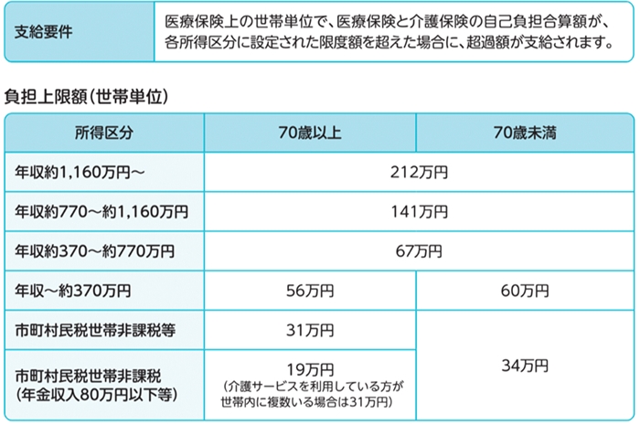 医療保険と介護保険の1年間(毎年8月1日〜翌年7月31日)の自己負担の合計額が高額な場合に、自己負担を軽減する制度です。