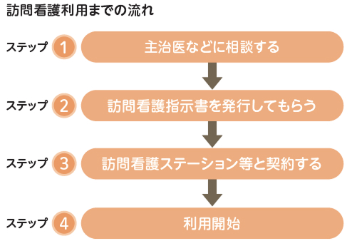 利用までの流れは、①主治医などに相談する、②訪問看護指示書を発行してもらう、③訪問看護ステーション等と契約する、④利用開始、というステップを踏みます。