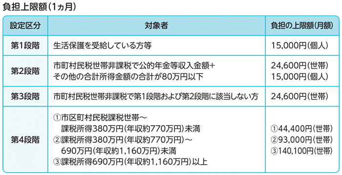 1ヵ月の利用者負担額(福祉用具購入費や食費・居住費等一部を除く)の合計額が所得に応じて区分された上限額を超えた場合、超過分が介護保険から支給されます。